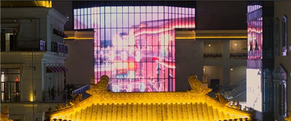 漫步在四海唐人街内,硕大的蒲公英造型装置、优美的音乐动感喷泉、精心设计的建筑亮化等让人沉浸其中,而最备受瞩目的正是位于中国城大牌坊后的572㎡户外透明屏。
